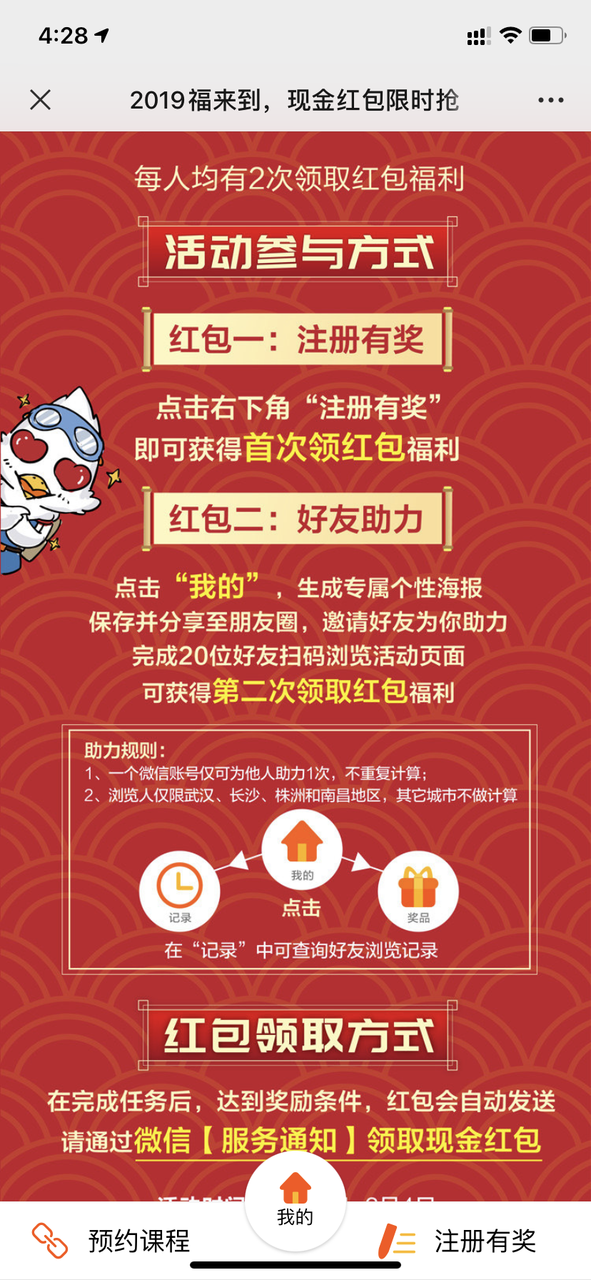 新年送红包主题,以新增有效浏 览作为红包任务引导用户转发, 体验课包吸引意向家长注册,链 接移动端官网实现品牌传播