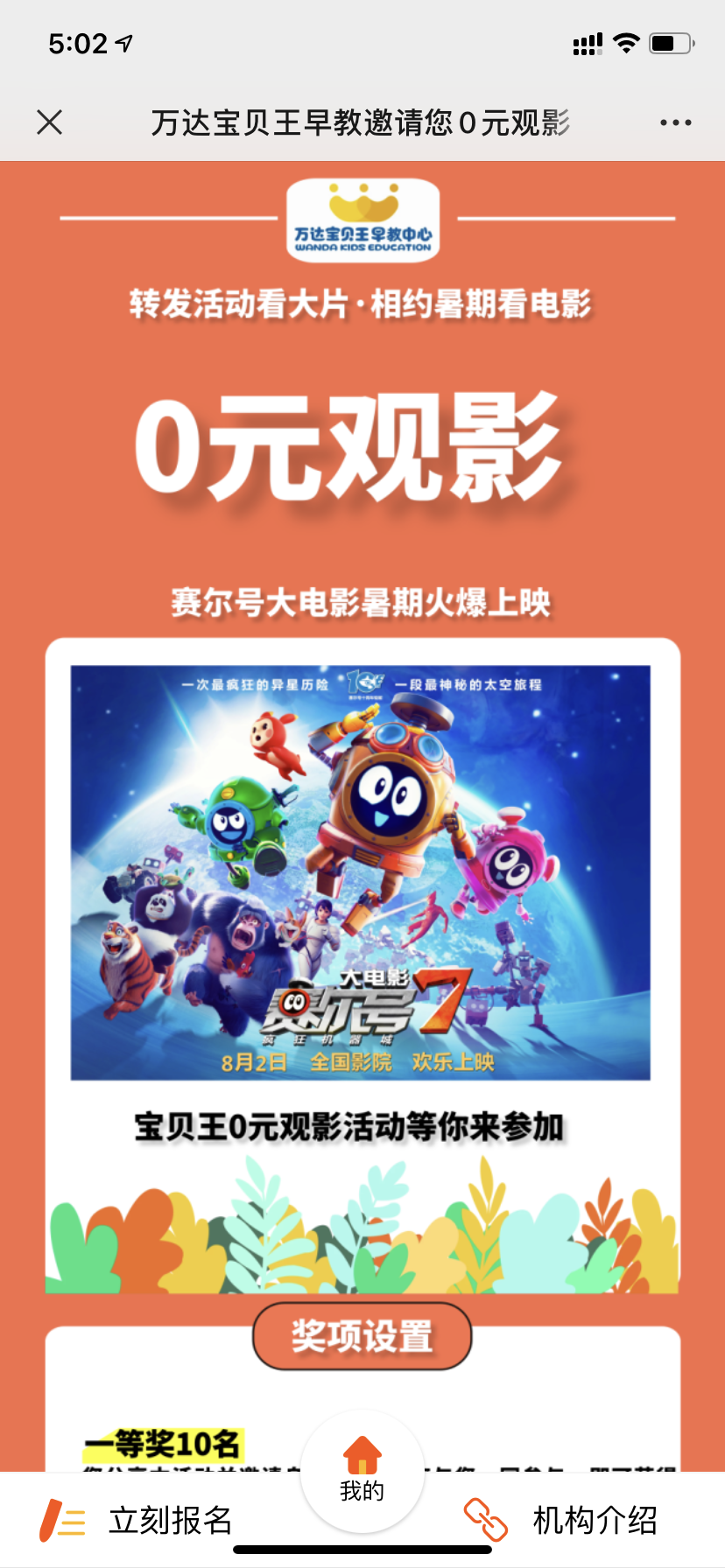 0元观影主题,分享活动并邀请其 他家庭组队获得电影兑换券,实现 精准转介绍
