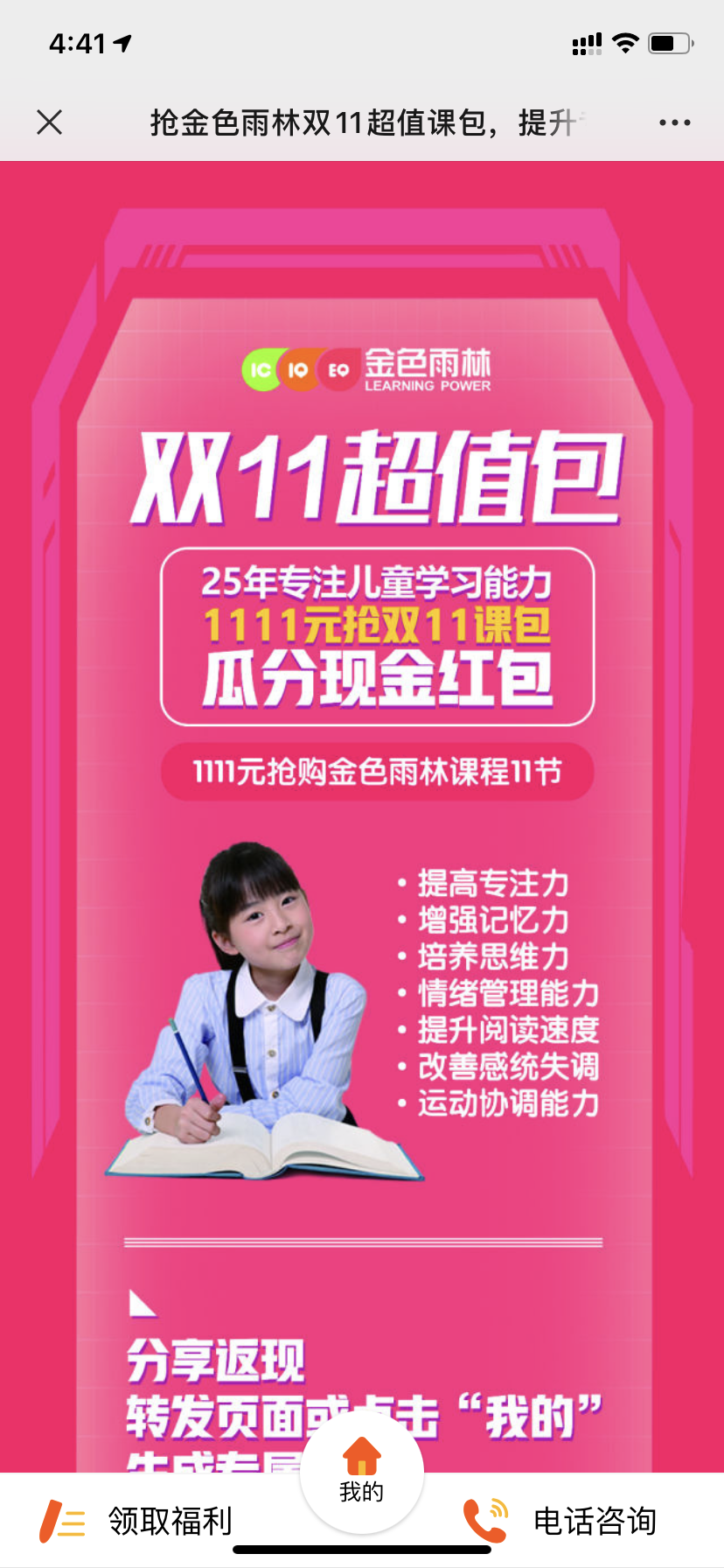 双11专属课包主题,以传播双11 优惠政策为主要目的,通过大额 现金红包引导家长定向邀约,积 分兑课程/实物礼品,刺激家长持 续分享