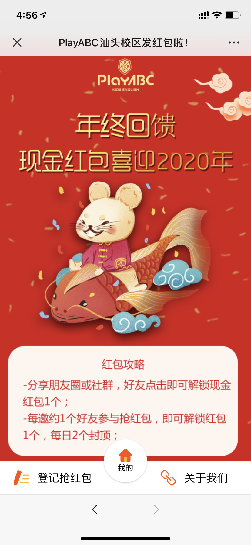 年终回馈主题,以浏览+有效名 单作为现金红包领取任务,引导 家长分享传播